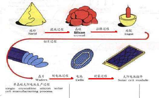 "硅"是我們這個(gè)星球上儲(chǔ)藏最豐富的材料之一。自從上個(gè)世紀(jì)科學(xué)家們發(fā) 現(xiàn)了晶體硅的半導(dǎo)體特性后,它幾乎改變了一切,甚至人類的思維,20世紀(jì)末,我們的生活中處處可見"硅"的身影和作用,晶體硅太陽電池是近15年來形成產(chǎn)業(yè)化最快的。生產(chǎn)過程大致可分為五個(gè)步驟:a)提純過程 b)拉棒過程 c)切片過程 d)制電池過程 e)封裝過程. 如下圖所示: