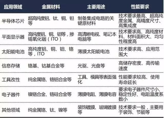 3、按應(yīng)用領(lǐng)域分類(lèi): 半導(dǎo)體芯片靶材、平面顯示器靶材、太陽(yáng)能電池靶材、信息存儲(chǔ)靶材、工具改性靶材、電子器件靶材、其他靶材